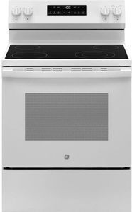 GE® 400 Series 30" White Freestanding Electric Range features 4-Burner Radiant Cooktop, Self-Clean with Steam Clean, Dual Element Oven, Oven Storage Drawer, New Easy-to-Use Controls, 4-Pass Bake Element, Halogen Oven Light , Sabbath Mode, and Nickel Racks.Read More