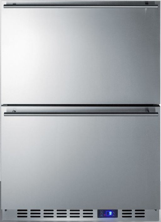 SUMMIT's outdoor collection of stainless steel drawer all-freezers combines the convenience of frost-free operation with the luxury of stainless steel to complete any outdoor kitchen in style. The SPFF51OS2D comes in a convenient 24" footprint and can be used freestanding or built-in under counters. The cabinet and drawers are constructed from weatherproof stainless steel, with sleek handles to complete the look. An integrated Ground Fault Circuit Interrupter helps to protect the unit in the event of circuit breaks and the sealed back adds extra protection from the elements. We include an anti-tip bracket (installed by the user) for added safety. Two sliding drawers offer convenient storage inside the 3.4 cu.ft. frost-free interior, with fan-forced cooling to ensure even temperature distribution. The drawers are fully constructed from stainless steel for easy cleaning and long-lasting use. Inside, a full-width sliding wire basket offers easy storage, while two adjustable dividers let you organize both the top and bottom drawer by separating the interior to accommodate a variety of items. Recessed LED lighting offers an attractive yet energy efficient look inside. The digital thermostat located in the stainless steel kickplate offers a readout in Celsius or Fahrenheit. Additional features include a Sabbath mode setting, temperature memory function, and audible alarms for high temperature fluctuations and open drawer alerts. The SPFF51OS2D can be used in home or commercial settings. This unit is ETL-S listed to NSF-7 standards and meets UL Commercial Standard 471. For a matching outdoor all-refrigerator, see the SPR627OS2D.