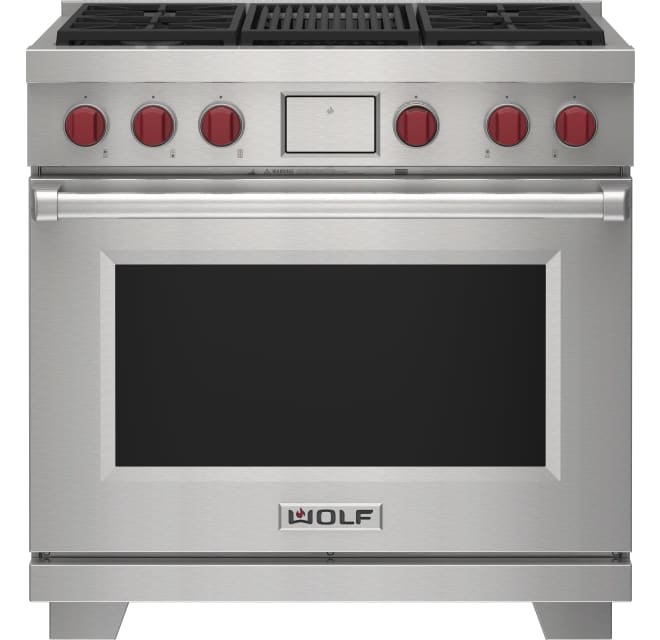 Wolf® 36" Stainless Steel Freestanding Dual Fuel Range features dual-stacked, sealed burners, Dual VertiFlow™ convection system, 10 chef-created cooking modes, Gourmet Mode, a temperature probe, self-clean, delayed start, timed cook, and Sabbath features.Read More